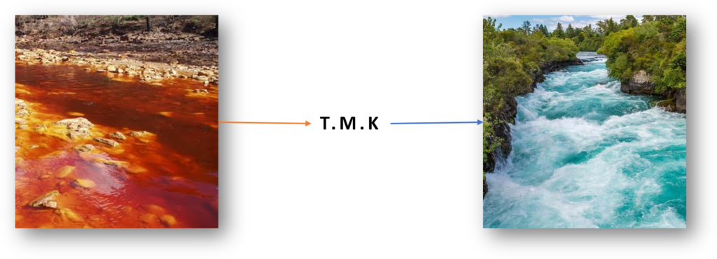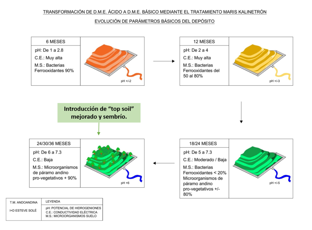 Duración, tratamiento y mejoras de pH y suelos por periodos. En esta figura pueden ver de forma aproximada de la duración y transformación de un depósito generador de drenaje ácido. Diferentes factores como el tipo de minerales, ubicación y precipitaciones pueden variar los tiempos de tratamiento, pero Maris Kalinetrón acabará por transformar los depósitos en no generadores de acidez y suelos verdes con riqueza vegetal. Una de las mayores virtudes del tratamiento es su sistema cerrado de alcalinización, ya que no se e vota remediación por el río , sino que una parte se reutiliza para estabilizar los depósitos y mejorar cada vez más y más.